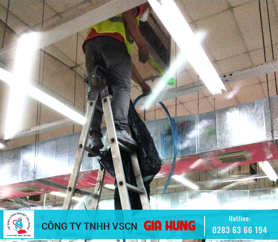 - Tiến hành làm sạch bụi bẩn và mạng nhện bám trên trần nhà, trên thanh đà, thanh ti nối dài, thanh sắt đứng, lưới chắn chôn trùng, hệ thống thông gió, quạt trần, cáp treo, hệ thống chiếu sáng…